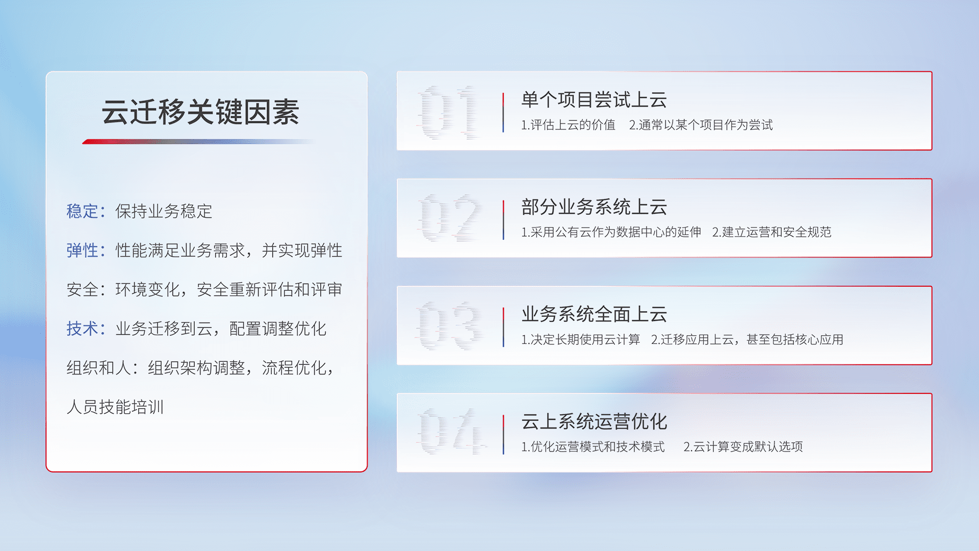 结合实际业务,,,从规划设计、、、云平台选型、、云原生改造、、、、数据迁移、、、、集成交付,,,,迁移全过程为客户识别最佳上云路径,,,做好风险识别管理,,设计网络架构、、、身份权限、、、安全审计合规、、操作审计、、日志审计、、、、监控告警策略、、多站点容灾设计等,,,,对云上基础设施进行整体规划,,,提升IT治理水平,,,以满足弹性、、、、高可用、、、、高性能的需求。。。。